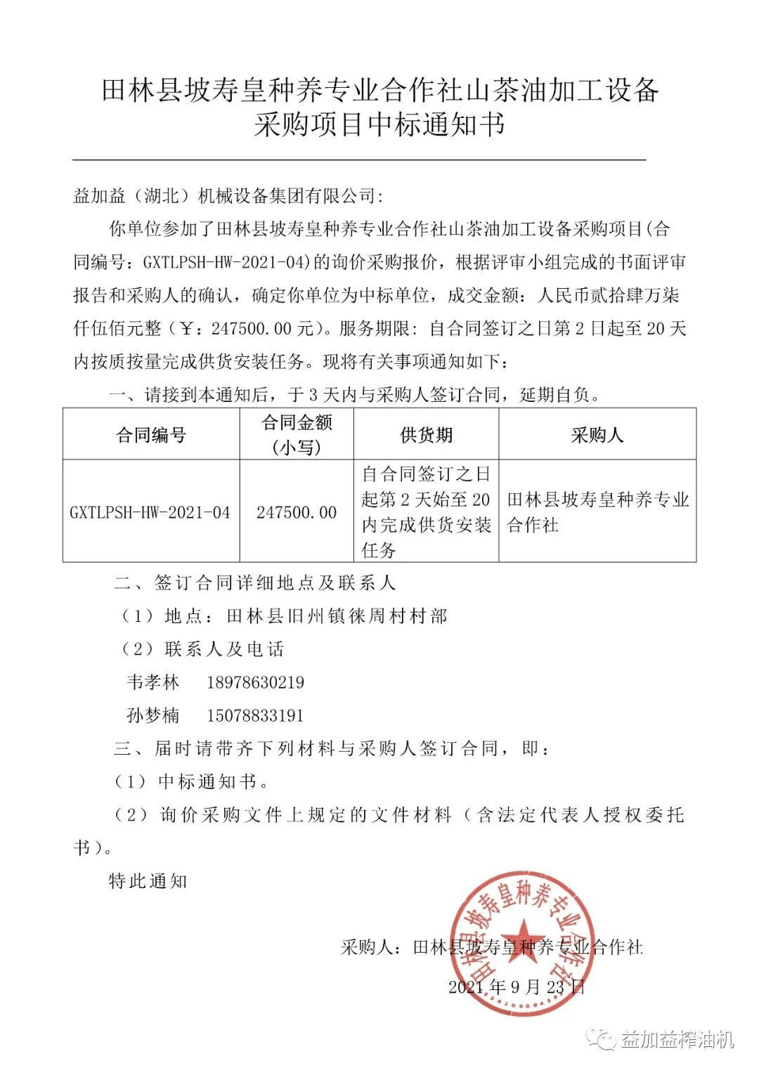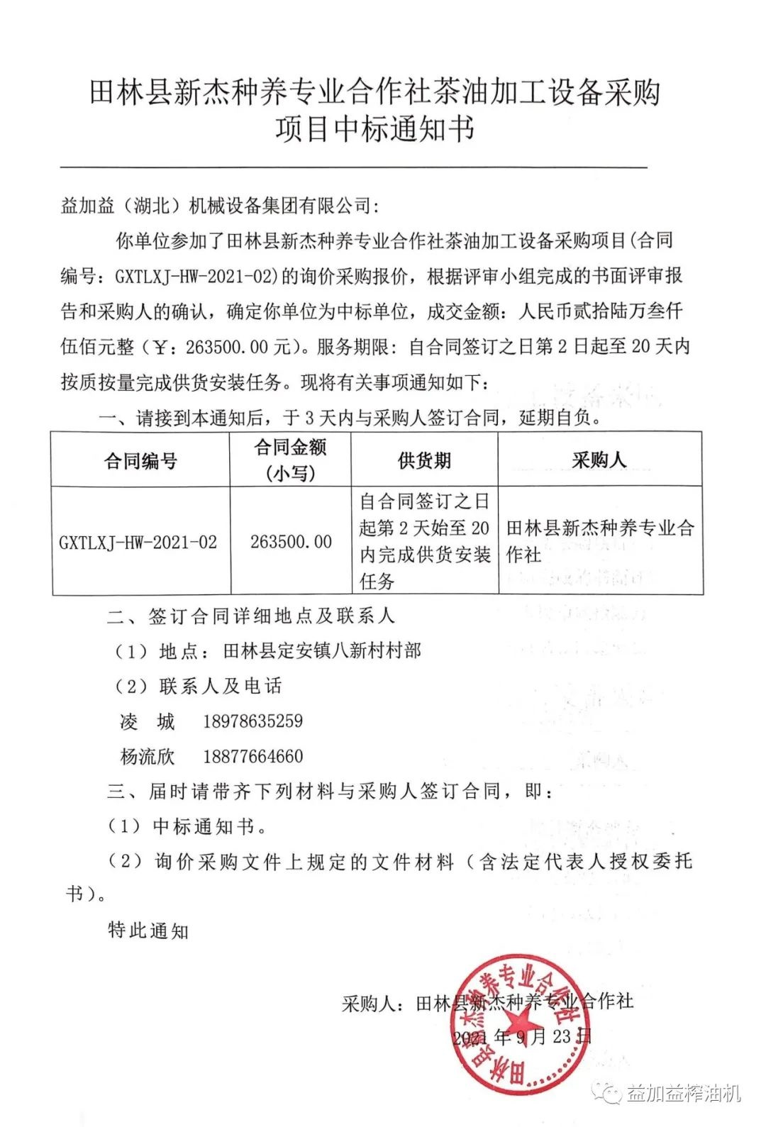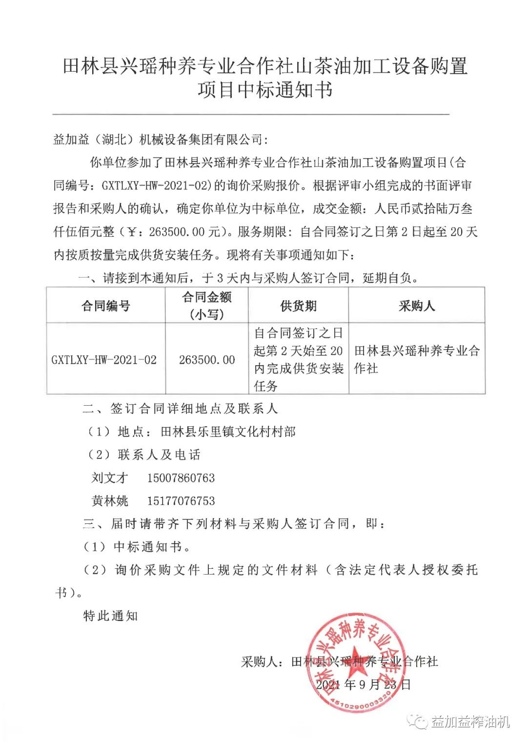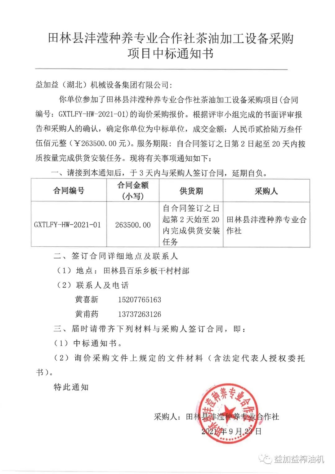 益加益集團憑借過硬的產品質量,扎實高效的工作作風,卓越的運作團隊和良好的企業信譽,在眾多競爭對手中脫穎而出,連續中標《中華人民共和國世界銀行貸款廣西貧困片區農村扶貧試點示范項目》中全部11家專業合作社山茶油加工設備的招標購置。