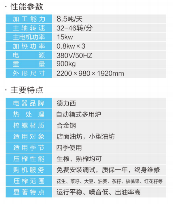 ★壓榨范圍:花生、大豆、菜籽、油葵、茶籽、芝麻等;★適用對象:店面油坊和微小油坊;★壓榨性能:熱榨一次榨盡,免費(fèi)安裝調(diào)試